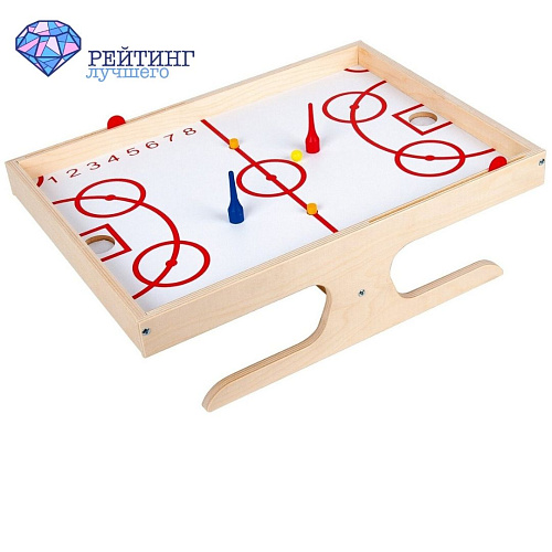 В отличие от классических настолок, Десятое королевство выпустил хоккей с магнитным полем. Вместо шайбы - мяч. Команду игроков сменили две фигурки, которые по принципу хоккея, пытаются забить гол в ворота соперника. Хотя ворота, в прямом смысле слова, отсутствуют, но есть специально очерченные выемки для мяча. Размеры игры 48\36 см. Высота 15 см. По периметру поля расположены деревянные бортики, которые предотвращают выпадение мяча. Каркас игры изготовлены из древесины. В комплектации есть механический счетчик очков. Такая хоккейная интерпретация подходит больше детям, для тренировки координации и скорости движений. Срок службы 1 год.