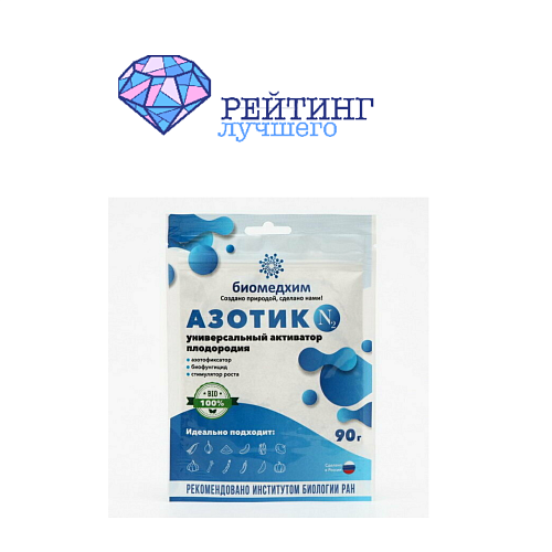 Этот небольшой пакетик весом всего 90 грамм может значительно изменить ваш огородный мир. Как говорится, мал, да удал! Азотик – активатор плодородия, который поможет вам ускорить созревание компоста и, как следствие, получить богатые плоды своих трудов. А ещё его рекомендует РАМН – так что он определённо знает, что делает.