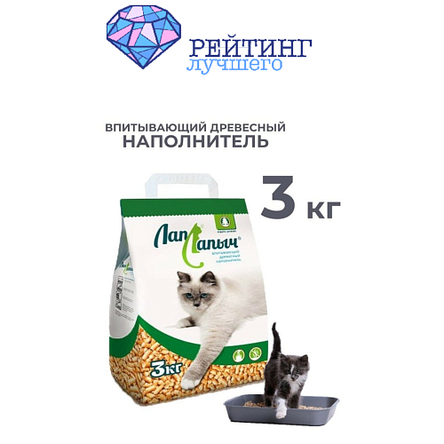Завершает наш рейтинг древесный впитывающий наполнитель ЛапЛапыч. Продукт имеет натуральный состав и полностью безопасен для животных. Подходит для домов, где есть люди, страдающие аллергией, питомцы, которые могут попробовать наполнитель на вкус. Он экологичен и может быть экономичным. Комкующийся древесный наполнитель образует маленькие комочки, которые можно смывать в канализацию. Однако несвоевременная уборка может привести к его распространению по квартире. Может пылить и прилипать к лапам длинношерстных кошек​.