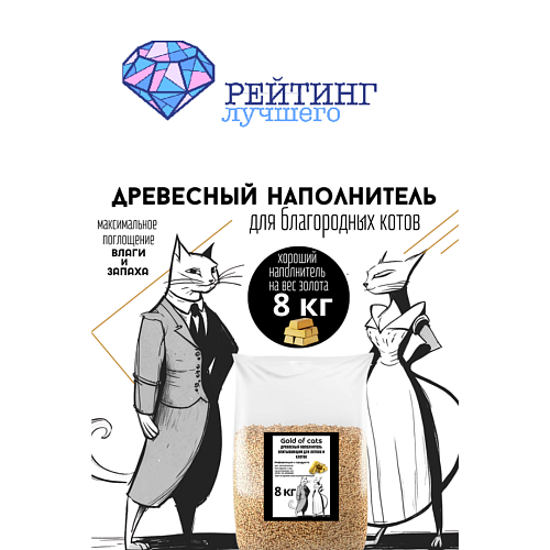Древесный наполнитель "Gold of cats" поставляется в упаковках по 8 кг. Представляет собой высококачественный продукт для ухода за кошками, кроликами, крысами, морскими свинками, птицами и другими мелкими домашними животными. Произведен в России. Наполнитель изготавливается из мягкой древесной стружки хвойных пород деревьев. В частности из 30% березы и 70% сосны. В составе нет вредных химических веществ.