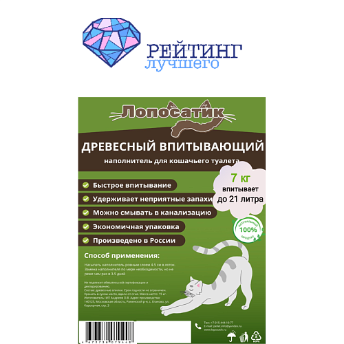 Предпоследнее место в нашем рейтинге занимает "Лопосатик" из линейки впитывающих древесных наполнителей. Это инновационное решение для обеспечения гигиены и комфорта домашних животных. Создан из экологически чистых древесных материалов. Является безопасным и гипоаллергенным. Продукт можно использовать не только для кошачьего туалета, но и для лотков морских свинок, декоративных крыс и хомяков.