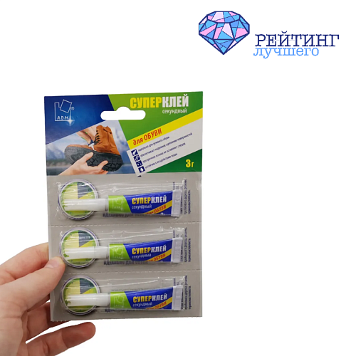 Вам знакома ситуация, когда любимая обувь внезапно нуждается в ремонте? Суперклей "А. Д. М." придет на помощь. Это секундный прозрачный обувной клей. Он поставляется в упаковке из трех тюбиков по 3 грамма каждый. Он просто идеален для экстренных ремонтных работ. Схватывается буквально за секунды. Вам не придется тратить много времени на ремонт.