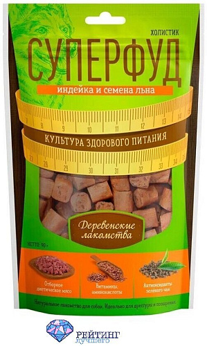Нежнейшее диетическое мясо индейки и семена льна объединились в настоящем суперфуде для вашего питомца, от производителя «Деревенские лакомства». Бренд давно известен в среде еды для животных и отличается качеством своих продуктов.