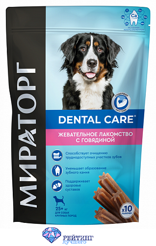 Говяжий деликатес для крупных четвероногих спутников Dental Care – продукт собственного производства компании Мираторг, специализирующегося на выпуске мясной продукции для людей и животных. Производитель контролирует все этапы производства своих продуктов и заслужил доверие и признание своих покупателей.
