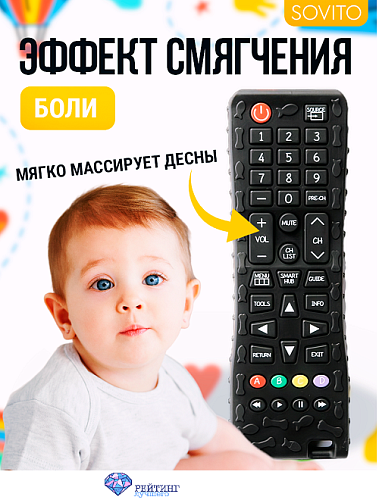 Каждый родитель знает, как маленькие дети любят всякие гаджеты и особой любовью у малышей пользуется пульт для телевизора. С учетом этого нюанса, производитель детских товаров выпустил прорезыватель для зубов в виде пульта. Изготовлен грызунок из безопасного пищевого силикона. Эффективно помогает уменьшить болевой синдром. Эргономичная форма и ребристая поверхность позволяют легко удерживать продукт в руках, развивают моторику ручек. Игрушечный пульт визуально полностью копирует вид оригинального пульта ДУ и несомненно станет любимым развлечением малыша. Прорезыватель легко чистится и моется. Разрешено кипятить для дезинфекции.