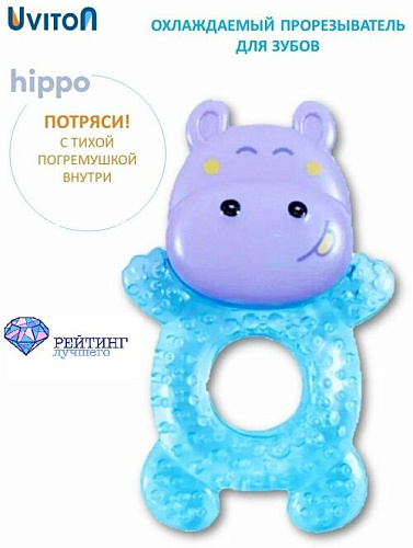 Игрушка выполнена в виде забавного бегемотика с улыбающейся мордашкой. Внутри туловища находится вода и пузырьки воздуха, которые надолго привлекут внимание непоседы. Еще одно преимущество погремушки – охлаждающий эффект.