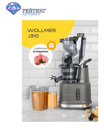 В комплект с моделью Wollmer J310 Extra Fresh входит насадка для приготовления сорбета. С ее помощью можно готовить замороженные десерты из ягод и фруктов, что делает процесс приготовления натуральных и полезных десертов очень простым и удобным. Мощность двигателя шнековой соковыжималки Wollmer J310 Extra Fresh составляет 200 Вт.