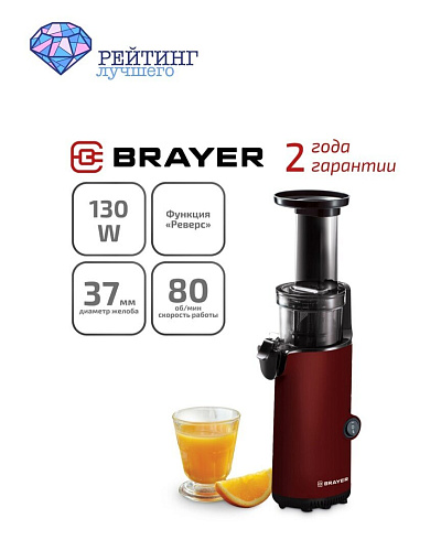 Ещё один вариант соковыжималки из бюджетного сегмента рынка – это современная и функциональная модель BRAYER BR1706. Максимальная скорость вращения устройства составляет 80 оборотов в минуту, что позволяет медленно и аккуратно измельчать и извлекать сок из загруженных ингредиентов. Рассматриваемая соковыжималка оснащена одним шнеком, который имеет размер горловины 45 мм, обеспечивая удобную загрузку продуктов. Объем ёмкости для сока составляет 0,6 литра, а для мякоти – 0,45 литра. Управление сокоизмельчителем осуществляется при помощи кнопочного и механического режимов. Предусмотрена возможность выбора только одной скорости вращения. Встроенный фильтр для сока обеспечивает чистоту и прозрачность получаемого напитка, удаляя избыточную мякоть.