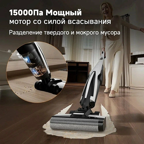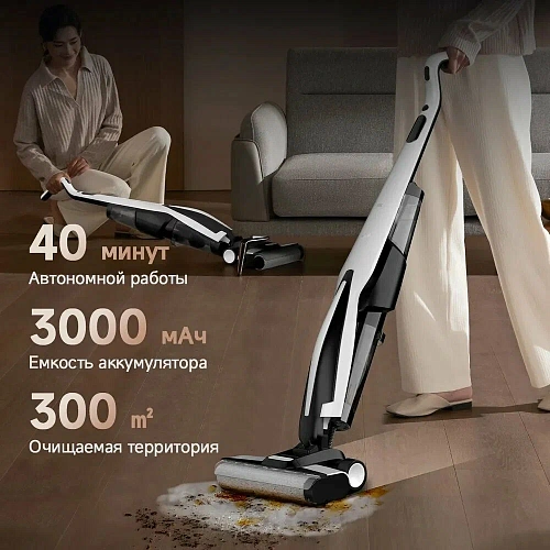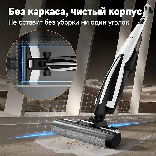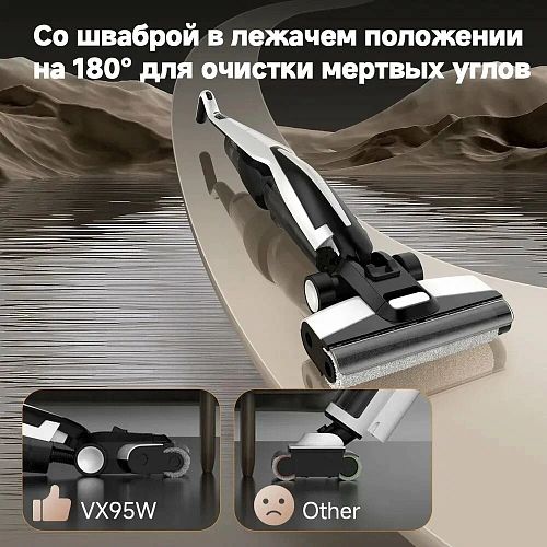 С первого взгляда Deerma VX95W производит приятное впечатление. Его корпус вытянутый, не громоздкий, с тонкой ручкой и легко узнаваемой щёткой. Благодаря поворотному механизму и складной конструкции, пылесос раскладывается почти полностью горизонтально. Он как будто "ложится" на пол — и легко заезжает под диваны и кровати, где другие просто не пройдут.