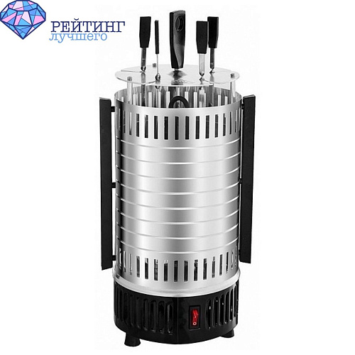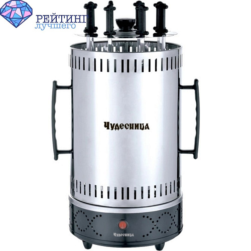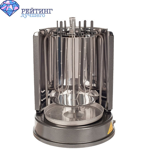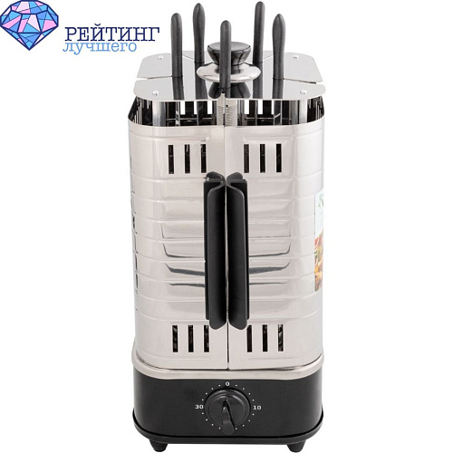 Мы решили добавить в список лучших электрошашлычниц эту модель, оснащенную 8 шампурами. Она абсолютно проста в использовании, потому как имеет всего одну кнопку вкл/выкл, и имеет компактную конструкцию, позволяющую устанавливать ее практически в любой части кухни. Да и вес 3 кг делает ее довольно портативной по сравнению со многими другими аналогичными приборами. Здесь нет таймера отключения и множества аксессуаров, но зато вам не придется ломать голову над освоением управления. Вращающиеся на 360 градусов шампуры обеспечивают равномерную прожарку мяса, а поскольку оно лишено растительного масла, то является действительно полезным для здоровья. При мощности 1450 Вт Чудесница ЭШ-1008T требует около 15-20 минут на приготовление пищи. Все элементы изготовлены из нержавеющей стали, а потому их легко обслуживать, особенно благодаря лотку для сбора жира, расположенному в нижней части машины.