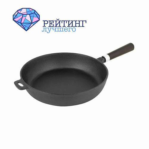 - Классическая. Имеет круглую форму с ручкой, обычно литой. Диаметр такого варианта может быть разным, как правило, достигает не более 28 см. Может быть изготовлена полностью из чугуна или покрыта эмалью. Подходит для приготовления большинства блюд. В зависимости от температурного режима, на ней можно жарить, тушить или готовить в режиме томления. Такая форма чугунной сковородки имеет большую популярность среди всех хозяек. В комплекте с ней может идти крышка. Однако же если её нет в комплекте, подойдёт любая стандартная.