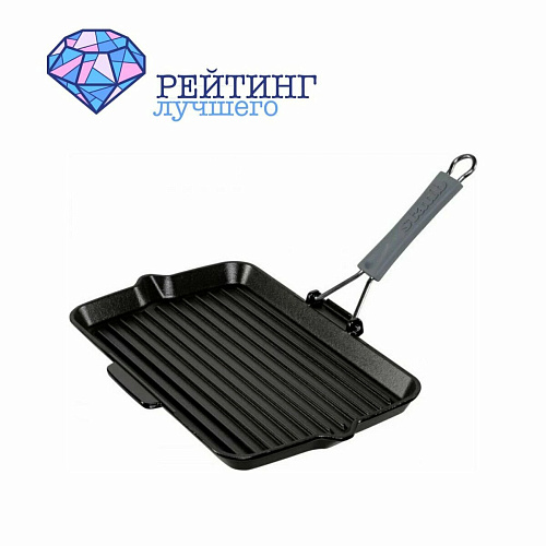 - Гриль. Посуда узконаправленной специфики, отличительная особенность которой ребристое дно. Оно минимизирует проникновение масла в ингредиенты. При этом компоненты быстро обжариваются, образуя корочку, под которой сохраняются все полезные свойства и соки. То есть мясные или рыбные деликатесы остаются сочными, при этом приготовленные в любой степени прожарки. Бывает квадратной и круглой формы. Иногда со специальным желобом для отвода лишней жидкости и масла. Благодаря оптимальной толщине, приготовление не занимает много времени, а после - еще долго остается теплой. В качестве крышки используется специальный пресс.