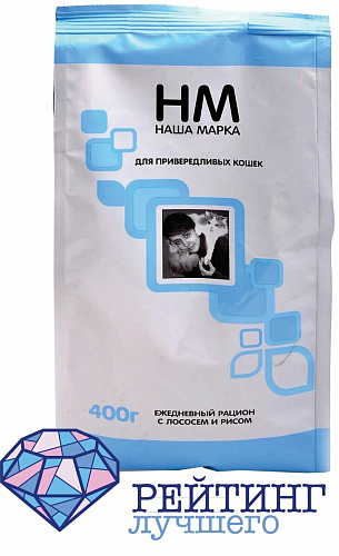 В завершение нашего рейтинга мы включаем корм для привередливых кошек бренда Наша марка. Фасовку сухого продукта премиум класса можно выбрать из 0,4, 2 и 15 килограммов, при этом поставляются они как по отдельности, так и в упаковках по 2, 10, 18, 26 и 34 штуки. В рецептуре используется лосось высшего качества, включены витамины A, D3, E. Таурин отвечает за здоровье глаз и хорошее зрение животного. За счет повышенного содержания белков и жиров животного и растительного происхождения продукт стал более питательным, что позволяет уменьшить порцию. Добавленные злаки, а именно кукуруза, повышают усвояемость, что обеспечивает заряд энергии четвероногого гурмана. Создан для кормления котиков возрастом от года и до шести лет. Отзывы на товар смешанные. Есть те, кто хвалит корм и говорит, что кошки кушают с удовольствием, а есть и те, чьи питомцы даже не подошли к предлагаемой еде. В остальном корм не уступает ни в чем своим аналогам, хорош на запах и цвет.
