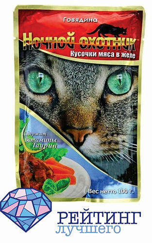 Бренд Ночной охотник имеет в своей линейке продукции влажный корм в виде кусочков мяса в желе. Поставляться он может как единичными пачками, так и упаковками, включающими в себя два, десять, восемнадцать, двадцать четыре, двадцать шесть и тридцать четыре штуки. Упакован он в мягкий герметичный пауч - пакет, который в верхних углах наделен небольшими засечками для удобного открывания. В пауч – пакете содержится сто граммов питания, чего вполне хватит для одного кормления. Консервы изготовлены из натурального мяса. В рецептуру не добавлено сои, консервантов и генно-модифицированных ингредиентов. Для ежедневного сбалансированного питания в состав желе включены питательные вещества, витамины A, D3, E и микроэлементы. Для большей питательности корм содержит злаки, которые еще и дадут заряд энергии пушистому гурману. Еда создана для кормления котов старше года, но не старше шести лет. Покупатели оставляют положительные отзывы о товаре. Хвалят его за фасовку паучей, баланс по составу и хорошие вкус и консистенцию. Отмечают, что коты и кошки едят его с удовольствием, при этом граммовки хватает даже с излишком. Немного огорчены, что мало где его можно найти в оффлайн продаже, и что немного выросла цена. Однако он все также остается недорогой едой.