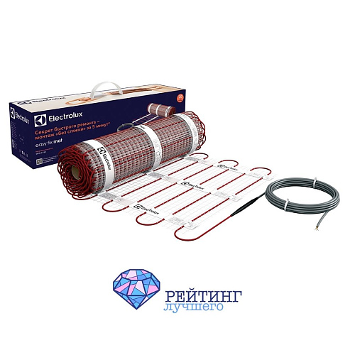 Продолжает список теплый мат Electrolux EEFM 2-150-2. Производство Израиль. Electrolux EEFM 2-150-2 – самоклеящаяся основа, с надежно вплетенным, тонким двухжильным кабелем (шаг укладки кабеля 7.4 см). За счет того, что основа пропитана клеем, она отлично распределяется на черновом полу, не образуя бугров. Производитель рекомендует монтировать теплый пол в тонкий слой плиточного клея. Толщина мата – 3.5 мм. То есть это идеальный вариант для укладки с минимальным поднятием уровня пола. Мат полностью безопасен, за счет трехслойной изоляции кабеля, включающая изоляцию из фторопласта. Благодаря витой конструкции, двужильный кабель при изгибе или растяжении, без дополнительной нагрузки, легко адаптируется к изменению геометрии. Длина мата – 4 м, ширина 0.5 м. Обогревает площадь с размером 2 м². Удельная мощность - 150 Вт/м². Длина кабеля для подключения – 2 метра. Срок службы – 50 лет.