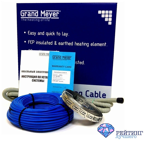 Голландский производитель Grand Meyer выпускает свою продукцию, соответствующую европейским стандартам, более 20 лет. Греющий кабель THС20-15 занимает почетное 10 место. Диаметр двужильного кабеля 5 мм, мощность 20 Вт/м. Его можно использовать под любой напольной поверхностью. Однако, следует иметь в виду, что монтаж осуществляется в слой цементной стяжки для надежной защиты от механических повреждений. Кабель гибкий. Благодаря этому свойству, не вызывает ограничений монтировать его в помещения сложной формы. Площадь обогрева зависит от шага укладки и составляет 1.3-2.1 м2. Длина греющего отрезка кабеля – 15 м. Производитель заявляет о сроке службы в 50 лет (гарантия 20 лет). В комплект входит кабель, гофрированная трубка с заглушкой для датчика температуры, монтажная лента, инструкция по установке и гарантийный талон. Подходит для монтажа в помещениях с увеличенной влажностью.