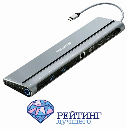 Док – станция Canyon 14-в-1 Type-C (CNS-HDS09B) способна расширить функционал вашего ПК за счет наличия четырнадцати выходов. Она дает возможность подключения трех мониторов через выходы Display Port, HDMI и VGA. Их технические характеристики: HDMI с 4K и 30 Гц; Display Port с 4K и 30 Гц); VGA разрешением до 1920x1080 и 60 Гц. Кроме того, здесь есть и аудио – выход для наушников или микрофона на 3,5 мм. Слоты для карт памяти SD и TF-карт позволяют просматривать, скачивать и производить другие манипуляции с файлами, записанных на фотоаппарат, видео – или экшн – камеру. Имеется и разъем для интернет – кабеля на 1000 Мбит, чтобы подключаться к сети напрямую. Это повысит скорость приема информации, что важно в онлайн - играх. Два порта USB типа С 3,0 и два типа С с поддержкой Power Delivery 100 Вт могут заряжать любые устройства, поддерживающие такой способ зарядки. Один USB конфигурации 2,0 обеспечивает скорость передачи данных до 480 Мбит в секунду. Корпус док – станции сделан в серебристом цвете, на торце расположен индикатор рабочего статуса. Покупатели оставляют положительные отзывы о товаре, хвалят его за большое количество интерфейсов, хорошую работоспособность. Отмечают, что немного шатается на ровной поверхности и нагревается при полной загрузке.