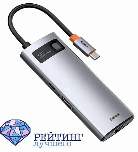 Многофункциональный Baseus Metal Gleam (CAHUB-CW0G) представляет собой не просто USB – концентратор, но и переходник серебристого цвета для переключения и использования разных типов гнезд. Материал многожильного пятнадцатисантиметрового кабеля – бескислородная медь с защитой от электронных и механических повреждений. Соединение с ПК осуществляется через USB – C, который можно использовать и для соединения с смартфоном, планшетами или ноутбуками. Сам коннектор из алюминиево – цинкового сплава можно спрятать в специальное отверстие в корпусе из алюминиевого сплава, что предотвратит механические повреждения или попадание пыли и загрязнений при хранении. Контакты покрыты золотом, что повышает срок службы разветвителя и обеспечивает надежное соединение. С противоположного торца располагается порт для интернет – кабеля, обеспечивающего передачу 10, 100 или 1000 Мбит в секунду. Три порта USB конфигурации 3,0 для быстрой работы с данными со скоростью 5 Гбит/с. Гнездо Type-C PD позволяет заряжать аккумуляторы до 100 Вт, используя поддержку системы Power Delivery. Выход HDMI 4K подойдет для высокопроизводительного воспроизведения видео 30 Гц с разрешением 4К. Слоты SD и MicroSD позволяют просматривать и переносить содержимое карт памяти с фотоаппаратов, видео – или экшн – камер. Приятным дополнением станет и функция Plug & Play, из – за которой вам не нужно заниматься установкой перед работой, нужно только произвести соединение переходника с компьютером. LED – индикатор укажет на статус работы аксессуара, все подключения в горизонтальной плоскости. Покупатели высоко оценили товар. Хвалят его за стильное оформление, многофункциональность, способность заряжать MacBook, добротную сборку, крепкий кабель и отсутствие царапин даже при неаккуратном применении. Стоит отметить, что размеры его сопоставимы с компьютерной мышью, и при полной загрузке наблюдается нагревание.