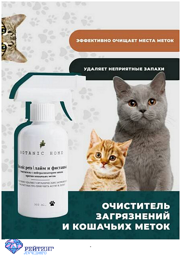 Очиститель с нейтрализатором запаха от Botanic home поможет не только избавиться от неприятного запаха, но и поможет приучить вашу кошку ходить в лоток. В составе средства эфирные масла лайма и фисташки. Это сочетание ароматов невероятно приятное для человеческого обоняния и совершенно не переносимое для кошек.