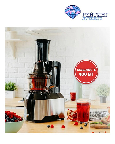 Ещё один вариант соковыжималки из бюджетного сегмента рынка – это современная и функциональная модель BRAYER BR1706. Максимальная скорость вращения устройства составляет 80 оборотов в минуту, что позволяет медленно и аккуратно измельчать и извлекать сок из загруженных ингредиентов. Рассматриваемая соковыжималка оснащена одним шнеком, который имеет размер горловины 45 мм, обеспечивая удобную загрузку продуктов. Объем ёмкости для сока составляет 0,6 литра, а для мякоти – 0,45 литра. Управление сокоизмельчителем осуществляется при помощи кнопочного и механического режимов. Предусмотрена возможность выбора только одной скорости вращения. Встроенный фильтр для сока обеспечивает чистоту и прозрачность получаемого напитка, удаляя избыточную мякоть.