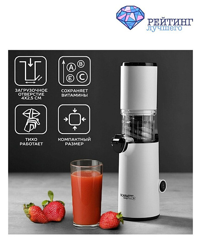 Ещё одна компактная и бюджетная модель соковыжималки – это Scarlett SC-JE50S59. Она подходит для тех, кто только начинает пробовать готовить свежие и натуральные соки, поскольку отличается простым и удобным управлением. Компактные габариты позволяют брать прибор с в путешествие или рабочую поездку. Рассматриваемая на данной позиции рейтинга модель обладает мощностью 130 Вт. Функциональные возможности устройства включают все необходимые стандартные опции для соковыжималки. Scarlett SC-JE50S59 оснащена ёмкостями для сока и жмыха объёмом по 0.6 литра.