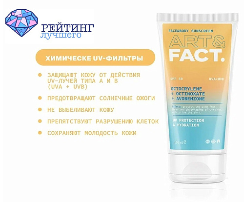ART&FACT SPF 50 — это весьма популярный крем, предназначенный для защиты тела от вредного воздействия ультрафиолета. Этот продукт обеспечивает барьер от UVB и UVA и помогает предотвратить возникновение ожогов. Забудьте про раздражение и фотостарение кожи. Он включает в себя инновационные фильтры, которые эффективно блокируют лучи солнца. Это позволяет сохранить ее здоровой.