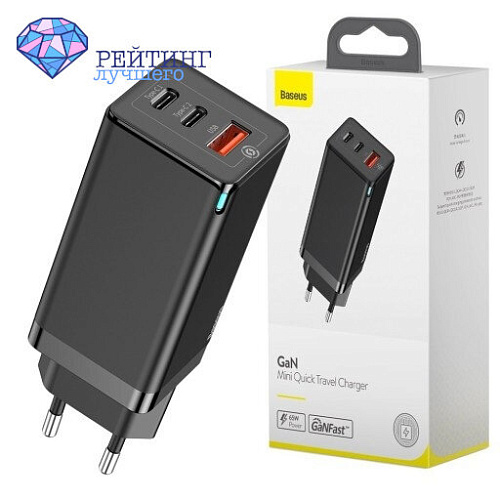 Интересный вариант зарядника появился у компании Baseus. Вариант получает 65 Вт и целых три разъема. На борту мы видим: два USB Type-C, один из них выдаёт до 65 Вт, другой – до 30 Вт. Также имеется и USB-A, мощность его не превышает 30 Вт. Приборчик от именитого разработчика наделен компактными размерами, эргономикой, стилем и мощностью. Это зарядное устройство станет верным помощником дома, в гостях, на работе и в путешествиях, кроме того, можно сразу заряжать несколько устройств, что не влияет на скорость зарядки. Примечательно, что он стильный и маленький, позволяет избавиться от лишних проводов. Новая модель на рынке Baseus GaN Quick Travel Charger 65W относится к новому поколению ЗУ GaN, в них применяется нитрид галлия. Это позволяет зарядному устройству и вашему гаджету сильно не перегреваться, а еще ЗУ потребляет минимум электроэнергии. Также данное инновационное решение позволяет зарядному устройству быть прилично компактнее своих кремниевых собратьев. Поддерживает актуальные стандарты быстрой зарядки: Quick Charge 4.0, Power Delivery, Huawei Super Charge (SPC и FCP), AFC.